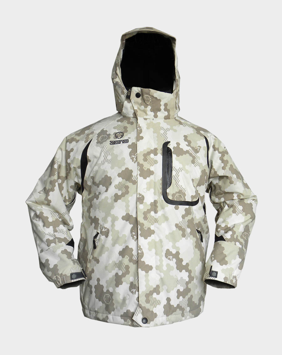 Shell: 228T taslon allover print(100% poly)+breathable PU milky coating Lining: tricot(100% poly)+210T coated taffeta+80G padding Waterproof:5000mm Windproof:100% Breathability:5000g/m2/24h |